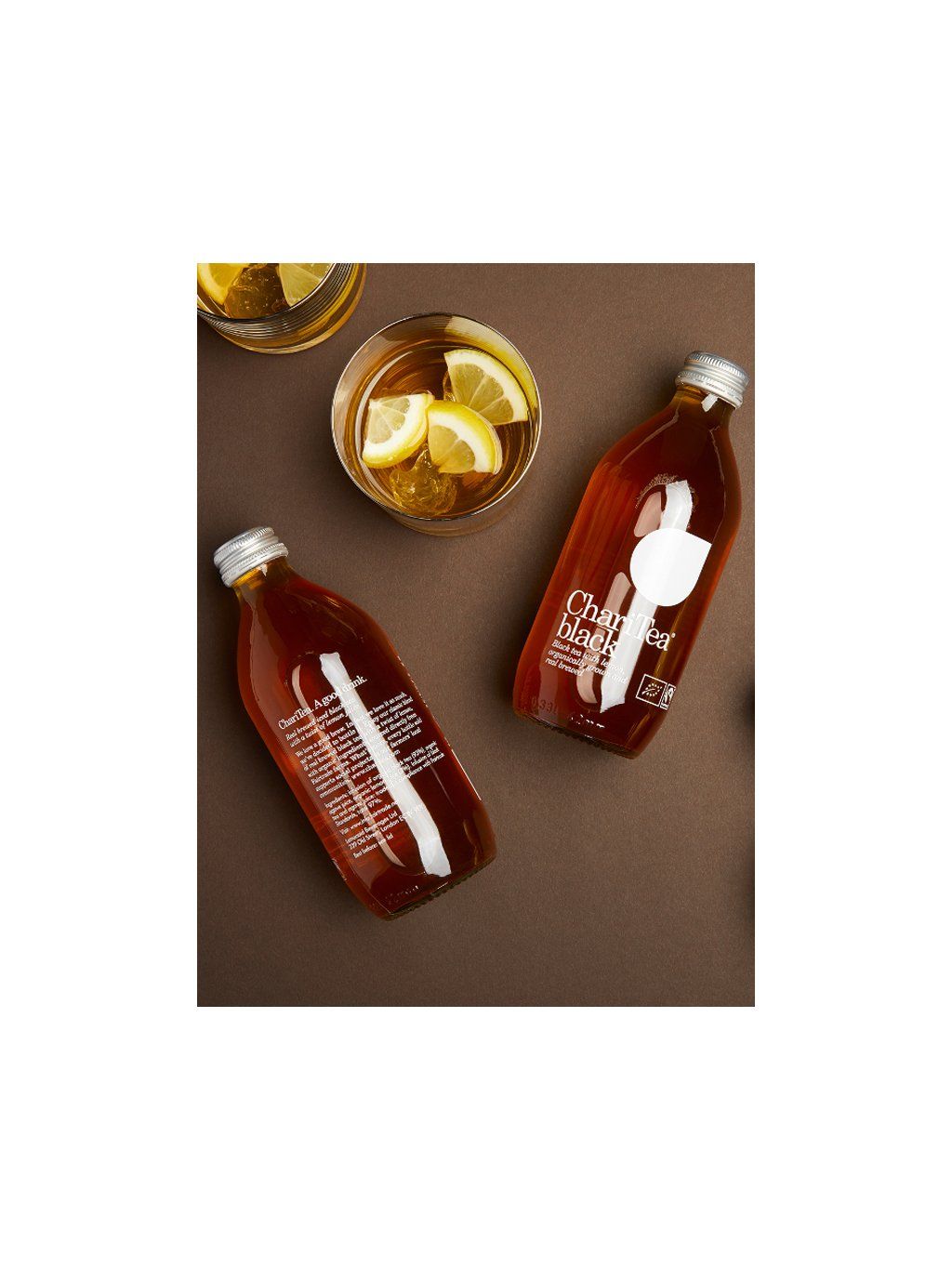 Nálev ledového černého čaje od značky ChariTea s citronovou šťávou, čerstvě uvařený a vyrobený pouze z organických surovin, je osvěžujícím nápojem, který neobsahuje žádný cukr, ale je slabě oslazený agávovým sirupem a ovocnou šťávou.