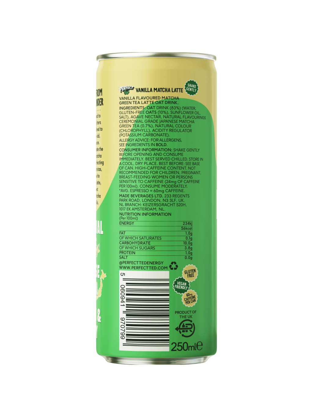 Tvoje nová denní jistota. Dokonale vyvážené matcha latte s jemnou vanilkou, vychlazené a připravené kdykoli dodat energii. Spojuje ceremoniální matchu z Japonska a sametový bezlepkový ovesný nápoj, takže chutná čistě, přirozeně a bez hořkosti. Obsahuje 60 mg kofeinu – ekvivalent jednoho espressa, jen bez nárazů a propadů. Přirozeně slazené agávovým sirupem, bez rafinovaného cukru, bez umělých sladidel a bez syntetického kofeinu.